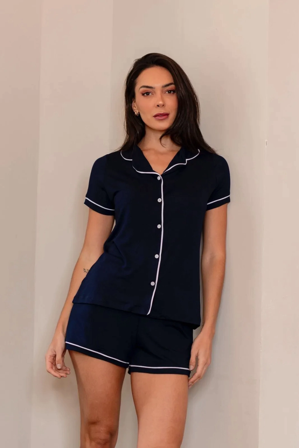 O modelo apresenta uma parte superior em camisa com mangas curtas e uma parte inferior em short, criando um visual leve e despojado. O fechamento é aberto, facilitando o vestir e despir. A combinação entre estilo e praticidade torna este pijama ideal para momentos de descanso em casa.