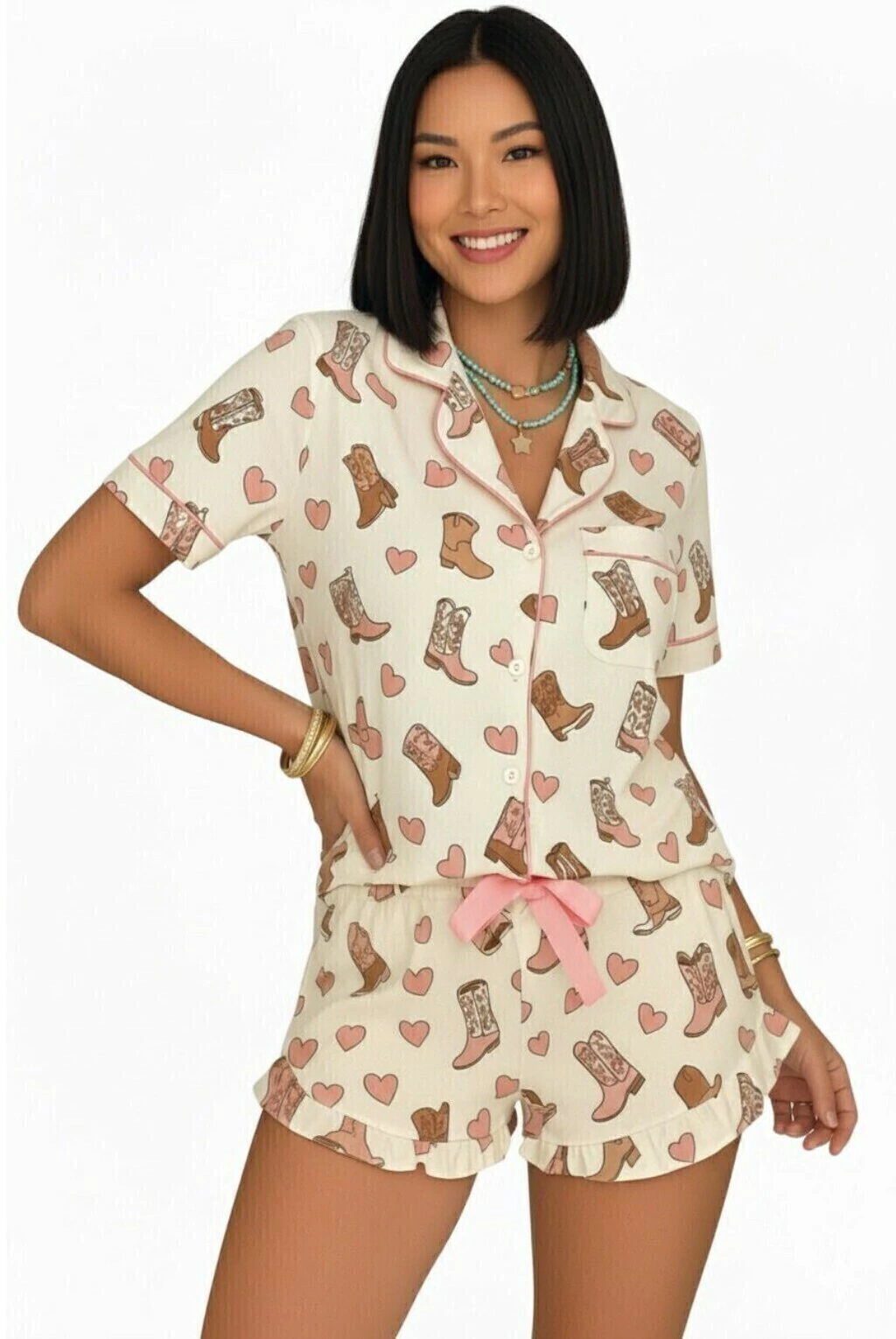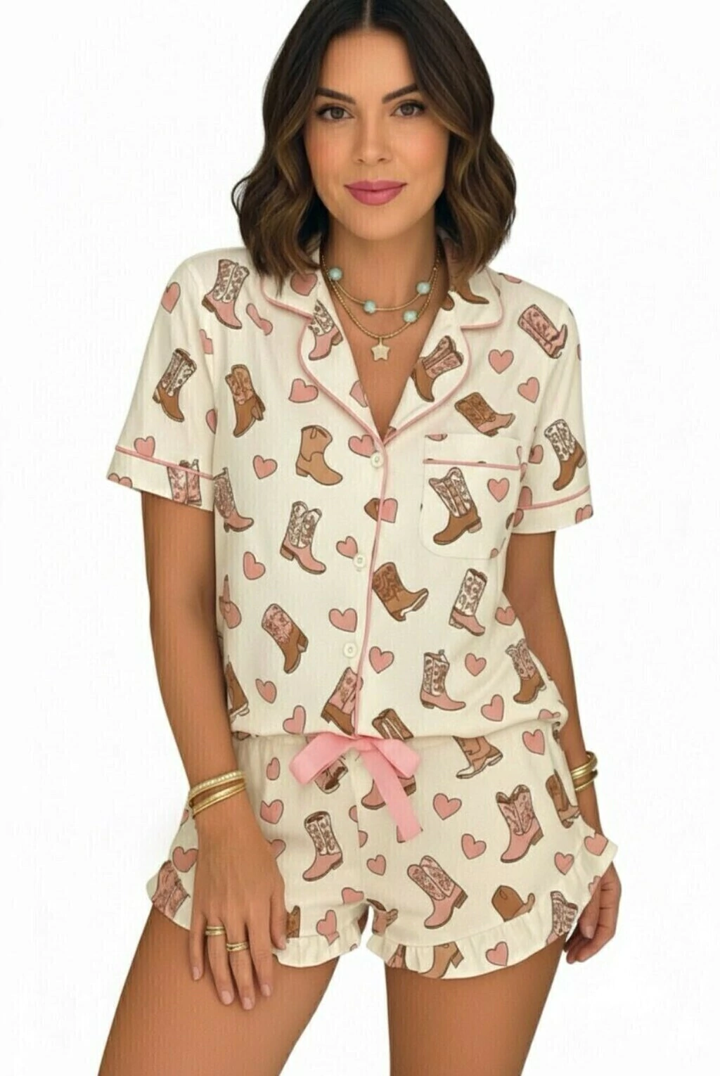 Conheça o Pijama Feminino Botão Shorts Babado - Botinha, feito com uma mistura incrível de 67% poliéster e 33% viscose que garante conforto e estilo para suas noites!