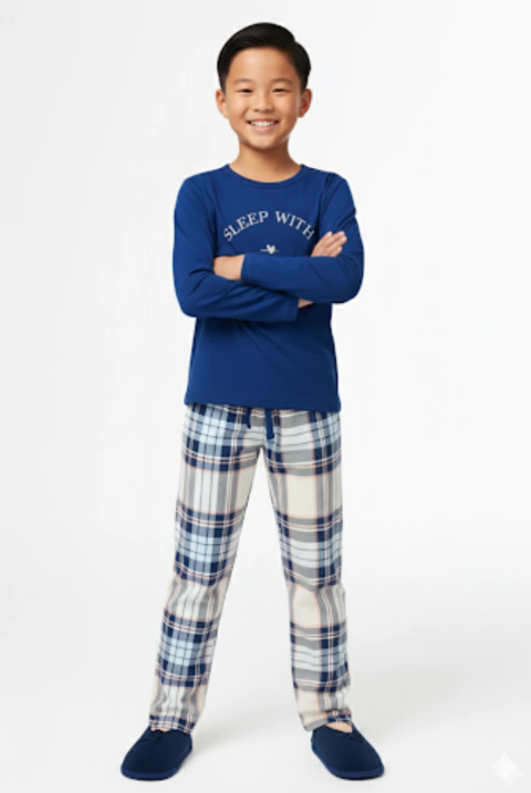 Feito com uma mistura de 67% poliéster e 33% viscose, o material principal é algodão, garantindo suavidade e respirabilidade. A estampa xadrez traz um toque clássico e divertido, tornando o pijama atraente para as crianças.