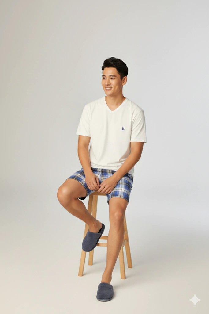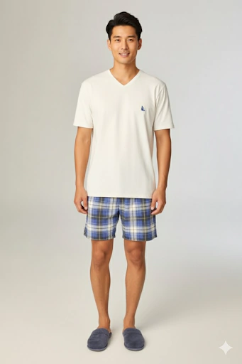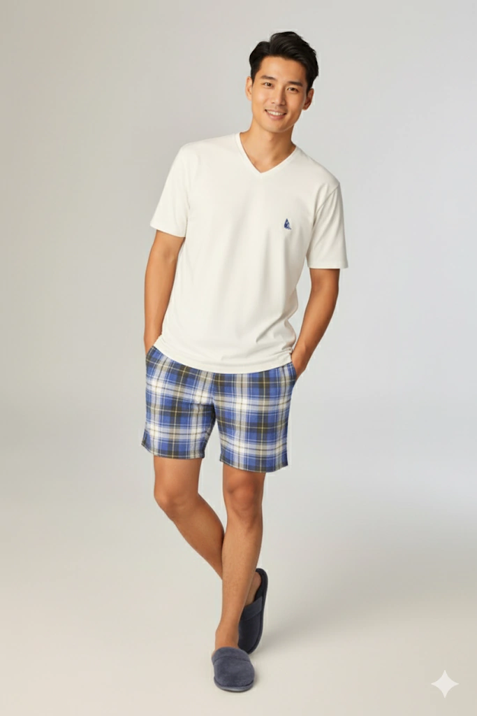 Pijama masculino confeccionado em malha leve. A blusa lisa, confeccionada em malha peach, conhecida pelo toque macio e aconchegante, que lembra a suavidade da pele de pêssego, com decote em “V” garante elegância e conforto, enquanto o short confeccionado em malha pv, traz uma estampa xadrez azul e branco criando um visual clássico e descontraído.