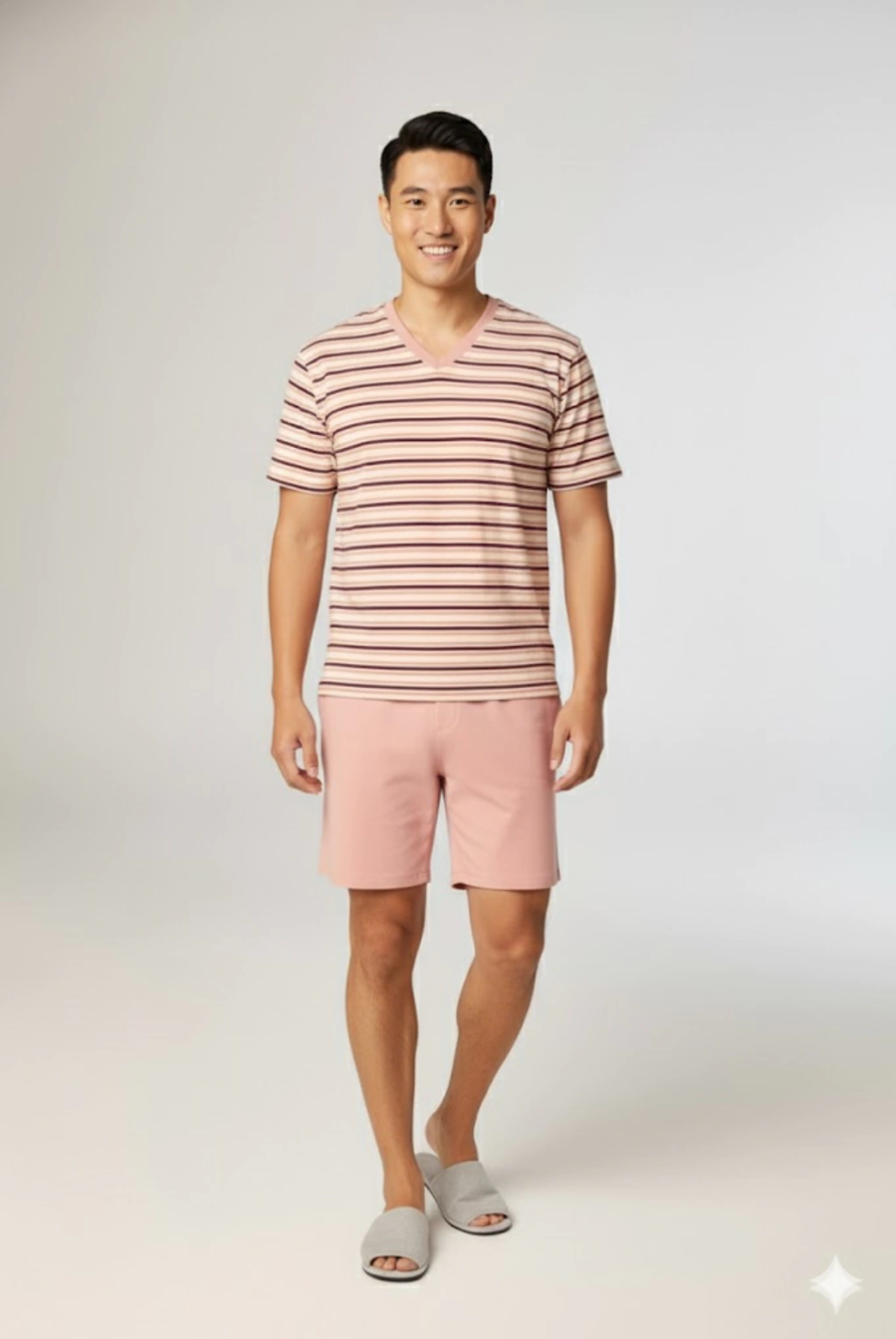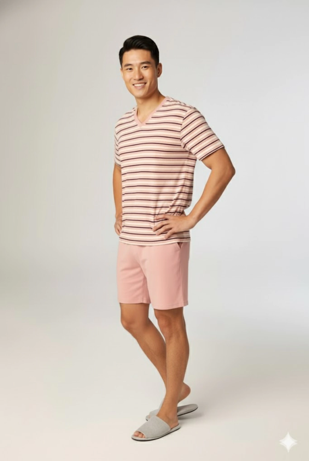 Pijama masculino confeccionado em liganete de poliamida, um tecido leve, macio e com toque geladinho que proporciona conforto durante toda a noite. A blusa de manga curta com listras modernas e decote em “V” garante estilo e praticidade, enquanto o short liso completa o visual com um caimento leve e agradável.
